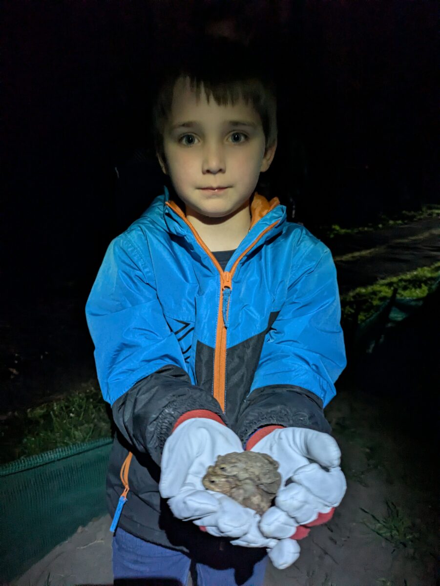 Am 22.03. wurde es dann richtig spannend. Wir haben uns gemeinsam mit den Eltern und den Kindern am Abend zum Kröten sammeln getroffen. Mit Taschenlampen, Schreibzeug und Eimern ging es dann los. Gesammelt wurden 127 Kröten. Das war ein voller Erfolg!! Nach sechs Wochen aktivem Amphibienschutz wurden insgesamt 726 Erdkröten, 47 Molche und 13 Frösche gerettet und in ihr Laichgewässer gebracht.